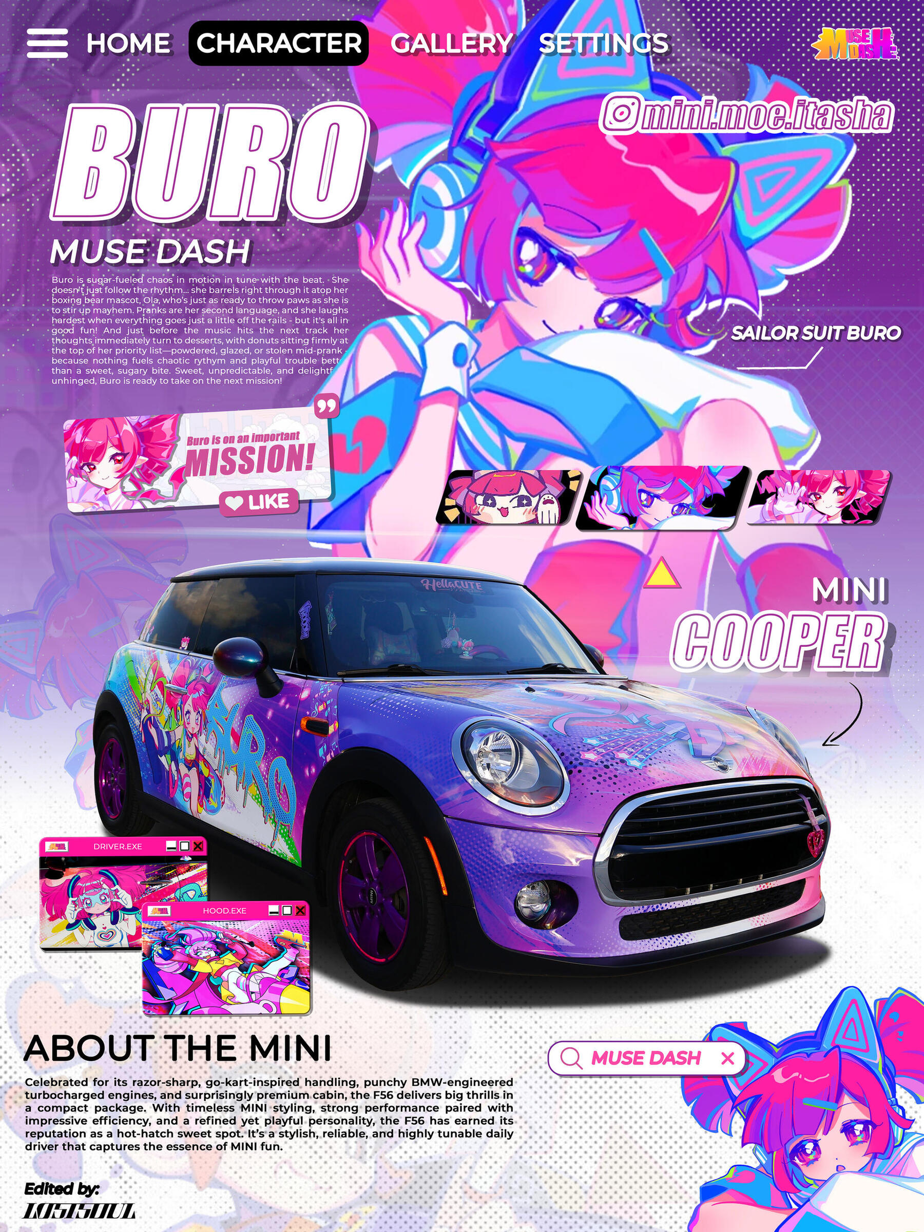 Mini Moé (萌え) 𝗣𝗿𝗼𝗻𝗼𝘂𝗻𝗰𝗲𝗱: Mih-nee Mo-ehJust a new itasha enthusiast, drifting into the scene with my MINI Muse ✨️Do not hesitate to reach out if you're interested in the MINI Muse showcasing at your event